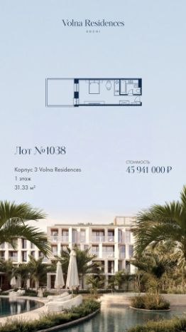 Продаётся 1-комнатная квартира в строящемся доме (Дом 3), срок сдачи: II-кв. 2028, общей площадью 31.33 кв.м., на 1 этаже. Volna Residence - это комплекс для жизни на территории комплекса Volna, объединённый с отелем общей концепцией и инфраструктурой. 3 малоэтажных корпуса на 520 номеров расположены на первой береговой линии и имеют собственный бассейн.