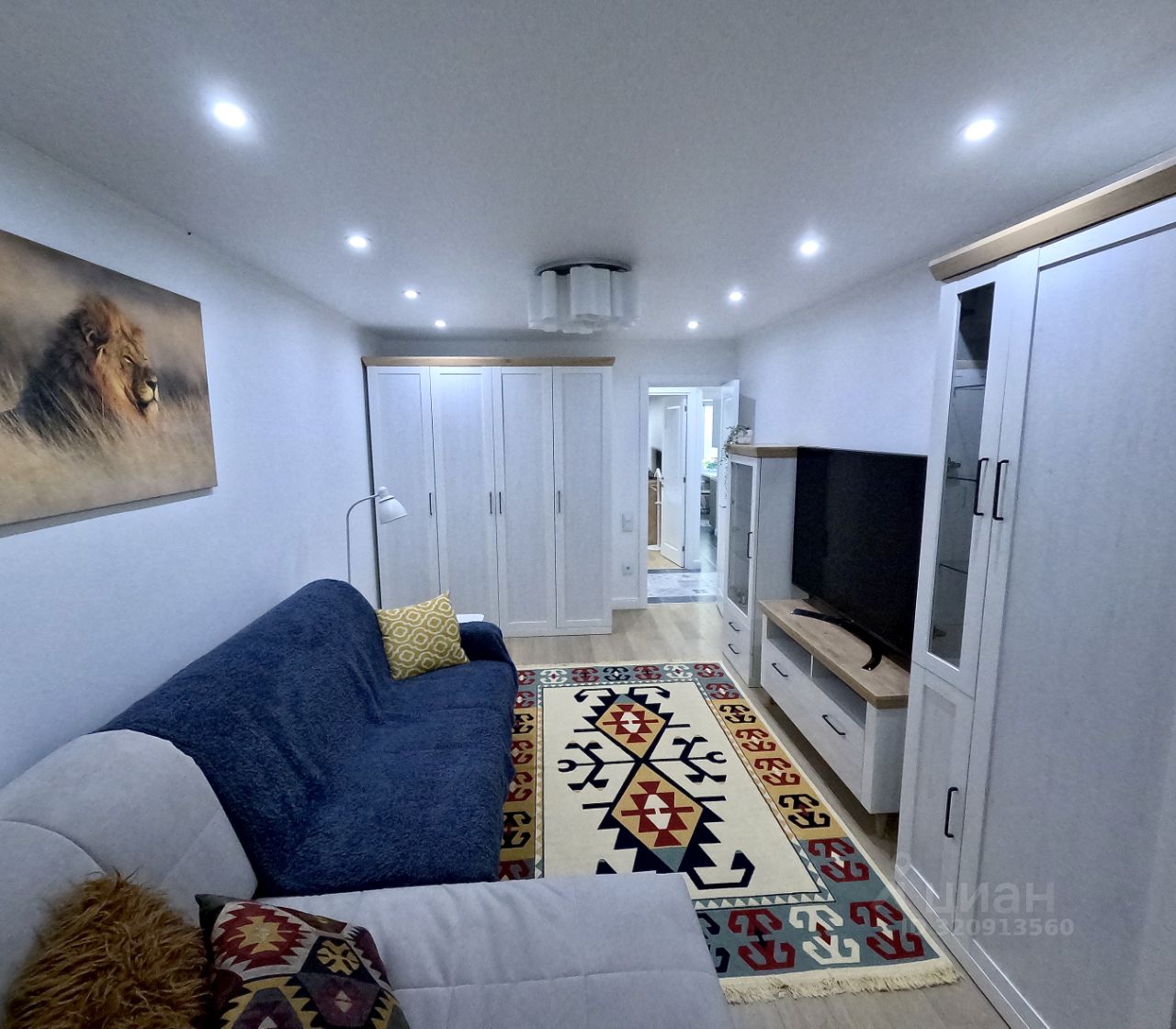 Просторная гостиная объединена с лоджией. Здесь установлен диван Askona (полноценное спальное место), большой шкаф для одежды, ТВ-тумба с ящиками, шкаф-стеллаж и сервант. На лоджии — дополнительный шкаф и место для организации рабочего кабинета или зоны отдыха. В комнате установлен кондиционер.