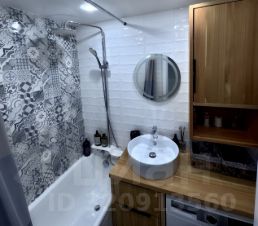 Ванная комната оборудована стиральной машиной Bosch, накладной раковиной со столешницей, шкафами для хранения, зеркалом с подсветкой и полотенцесушителем.