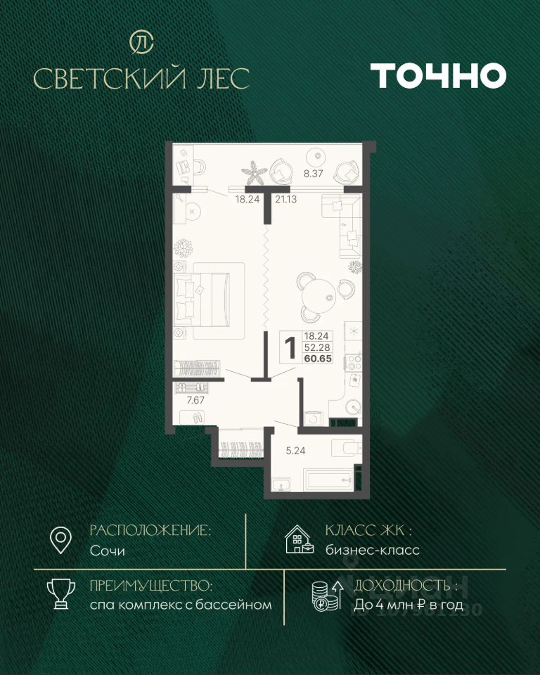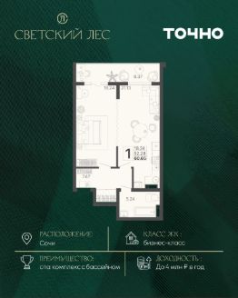 ЖК "Светский лес" — эксклюзивный жилой проект бизнес-класса в Сочи. Это остров цивилизации и технологий в окружении дикой природы национального парка с богатой инфраструктурой, наполненной различными сценариями премиального отдыха и жизни. Общественное пространство жилого комплекса включает в себя прогулочные зоны, спа-комплекс с круглогодичным бассейном, детские и спортивные площадки, велодорожки, собственную набережную реки Сочи, торговую галерею с супермаркетами и ресторанами, а также инновационную школу на 1510 мест и детский сад на 510 мест. Квартира в ЖК "Светский лес" — идеальный вариант как для жизни у моря, так и для инвестиций. Удобный сервис доверительного управления позволит легко зарабатывать на недвижимости в ЖК "Светский лес" до 4 млн. руб. в год.*
