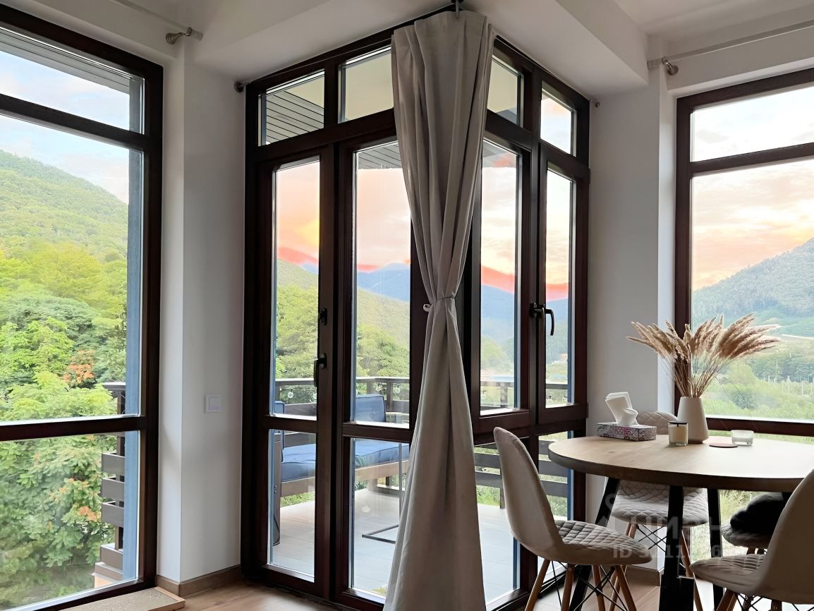 Эргономичная планировка: 2 спальни, кухня-гостиная. Витражные окна с панорамным видом на горы.