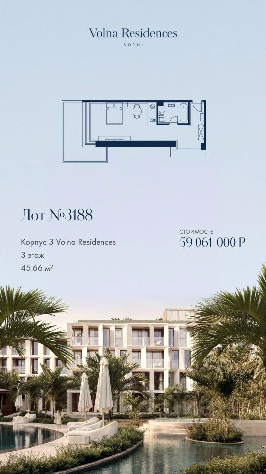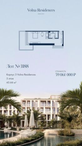 Продаётся 1-комнатная квартира в строящемся доме (Дом 3), срок сдачи: II-кв. 2028, общей площадью 45.66 кв.м., на 4 этаже. Volna Residence - это комплекс для жизни на территории комплекса Volna, объединённый с отелем общей концепцией и инфраструктурой. 3 малоэтажных корпуса на 520 номеров расположены на первой береговой линии и имеют собственный бассейн. Территория комплекса Volna - 7,2 га. Более половины этой территории занимает парк и инфраструктура для жизни и отдыха.