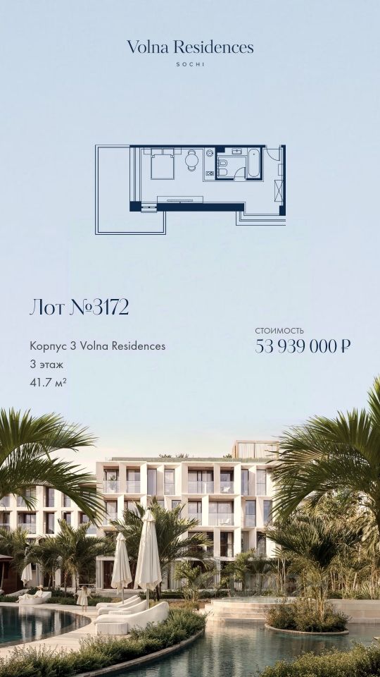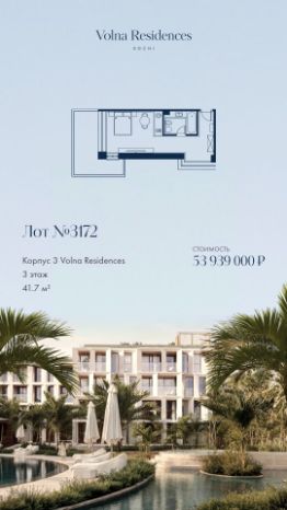 Продаётся 1-комнатная квартира в строящемся доме (Дом 3), срок сдачи: II-кв. 2028, общей площадью 41.7 кв.м., на 4 этаже. Volna Residence - это комплекс для жизни на территории комплекса Volna, объединённый с отелем общей концепцией и инфраструктурой. 3 малоэтажных корпуса на 520 номеров расположены на первой береговой линии и имеют собственный бассейн.