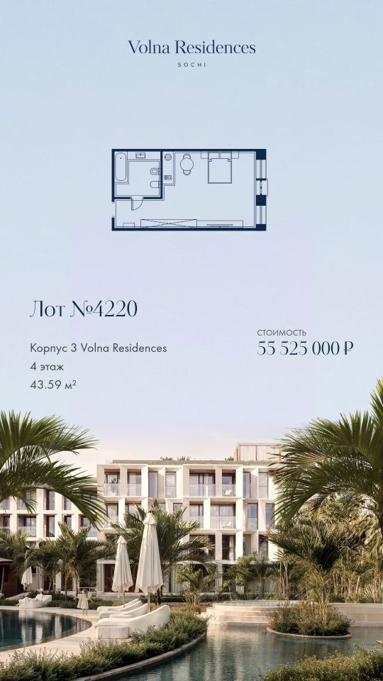 Продаётся 1-комнатная квартира в строящемся доме (Дом 3), срок сдачи: II-кв. 2028, общей площадью 43.59 кв.м., на 4 этаже. Volna Residence - это комплекс для жизни на территории комплекса Volna, объединённый с отелем общей концепцией и инфраструктурой. 3 малоэтажных корпуса на 520 номеров расположены на первой береговой линии и имеют собственный бассейн.