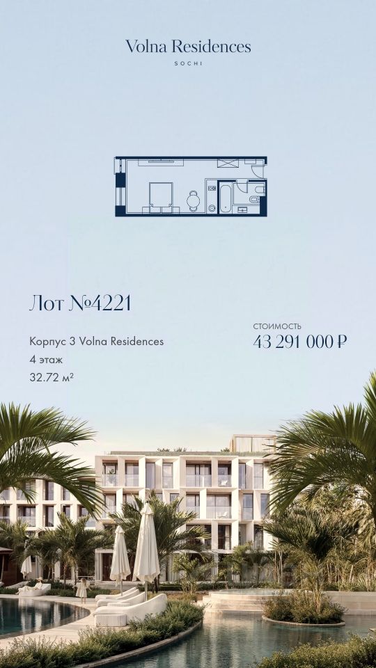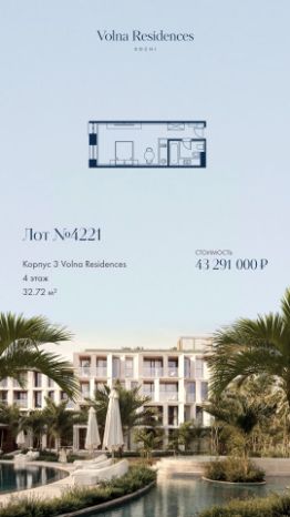 Продаётся 1-комнатная квартира в строящемся доме (Дом 3), срок сдачи: II-кв. 2028, общей площадью 32.72 кв.м., на 4 этаже. Volna Residence - это комплекс для жизни на территории комплекса Volna, объединённый с отелем общей концепцией и инфраструктурой. 3 малоэтажных корпуса на 520 номеров расположены на первой береговой линии и имеют собственный бассейн.