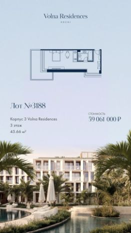 Продаётся 1-комнатная квартира в строящемся доме (Дом 3), срок сдачи: II-кв. 2028, общей площадью 45.66 кв.м., на 4 этаже. Volna Residence - это комплекс для жизни на территории комплекса Volna, объединённый с отелем общей концепцией и инфраструктурой. 3 малоэтажных корпуса на 520 номеров расположены на первой береговой линии и имеют собственный бассейн.