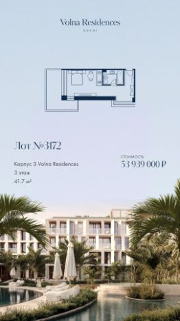 Продаётся 1-комнатная квартира в строящемся доме (Дом 3), срок сдачи: II-кв. 2028, общей площадью 41.7 кв.м., на 4 этаже. Volna Residence - это комплекс для жизни на территории комплекса Volna, объединённый с отелем общей концепцией и инфраструктурой. 3 малоэтажных корпуса на 520 номеров расположены на первой береговой линии и имеют собственный бассейн.