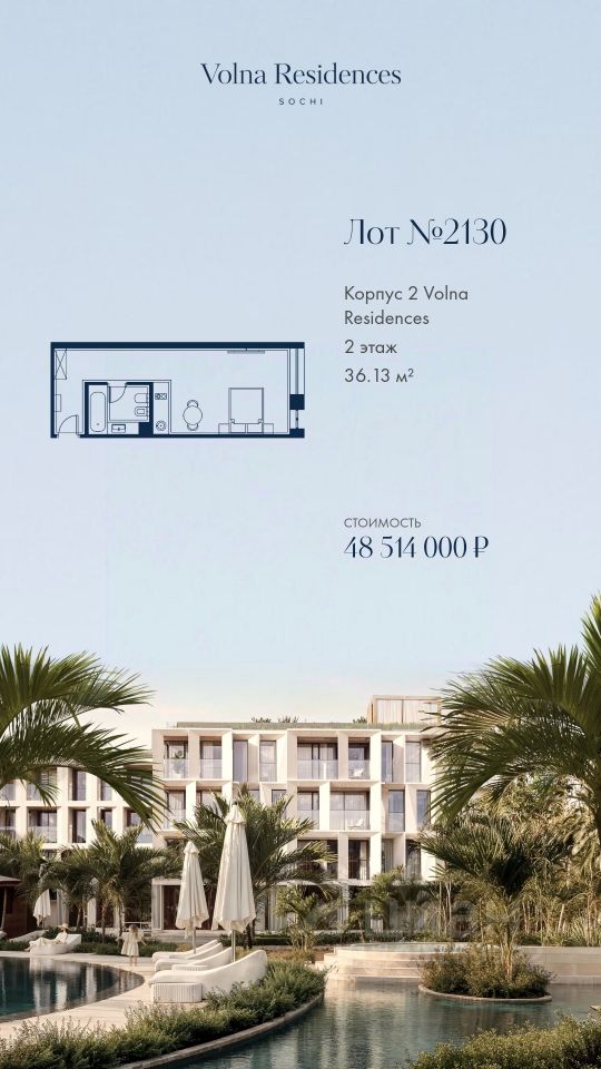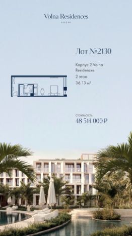 Продаётся 1-комнатная квартира в строящемся доме (Дом 2), срок сдачи: II-кв. 2028, общей площадью 36.13 кв.м., на 2 этаже. Volna Residence - это комплекс для жизни на территории комплекса Volna, объединённый с отелем общей концепцией и инфраструктурой. 3 малоэтажных корпуса на 520 номеров расположены на первой береговой линии и имеют собственный бассейн.