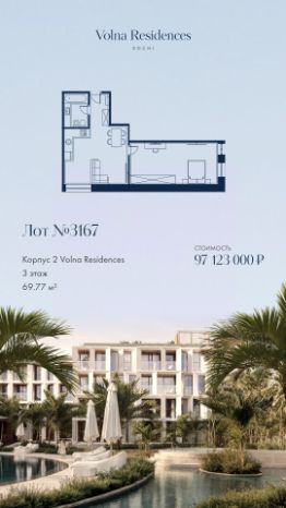 Продаётся 1-комнатная квартира в строящемся доме (Дом 2), срок сдачи: II-кв. 2028, общей площадью 69.77 кв.м., на 2 этаже. Volna Residence - это комплекс для жизни на территории комплекса Volna, объединённый с отелем общей концепцией и инфраструктурой. 3 малоэтажных корпуса на 520 номеров расположены на первой береговой линии и имеют собственный бассейн.
