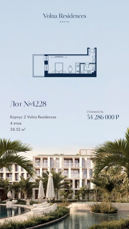 Продаётся 1-комнатная квартира в строящемся доме (Дом 2), срок сдачи: II-кв. 2028, общей площадью 38.52 кв.м., на 2 этаже. Volna Residence - это комплекс для жизни на территории комплекса Volna, объединённый с отелем общей концепцией и инфраструктурой. 3 малоэтажных корпуса на 520 номеров расположены на первой береговой линии и имеют собственный бассейн.
