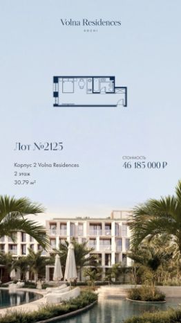 Продаётся 1-комнатная квартира в строящемся доме (Дом 2), срок сдачи: II-кв. 2028, общей площадью 30.79 кв.м., на 4 этаже. Volna Residence - это комплекс для жизни на территории комплекса Volna, объединённый с отелем общей концепцией и инфраструктурой. 3 малоэтажных корпуса на 520 номеров расположены на первой береговой линии и имеют собственный бассейн.