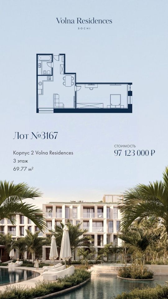 Продаётся 1-комнатная квартира в строящемся доме (Дом 2), срок сдачи: II-кв. 2028, общей площадью 69.77 кв.м., на 4 этаже. Volna Residence - это комплекс для жизни на территории комплекса Volna, объединённый с отелем общей концепцией и инфраструктурой. 3 малоэтажных корпуса на 520 номеров расположены на первой береговой линии и имеют собственный бассейн.