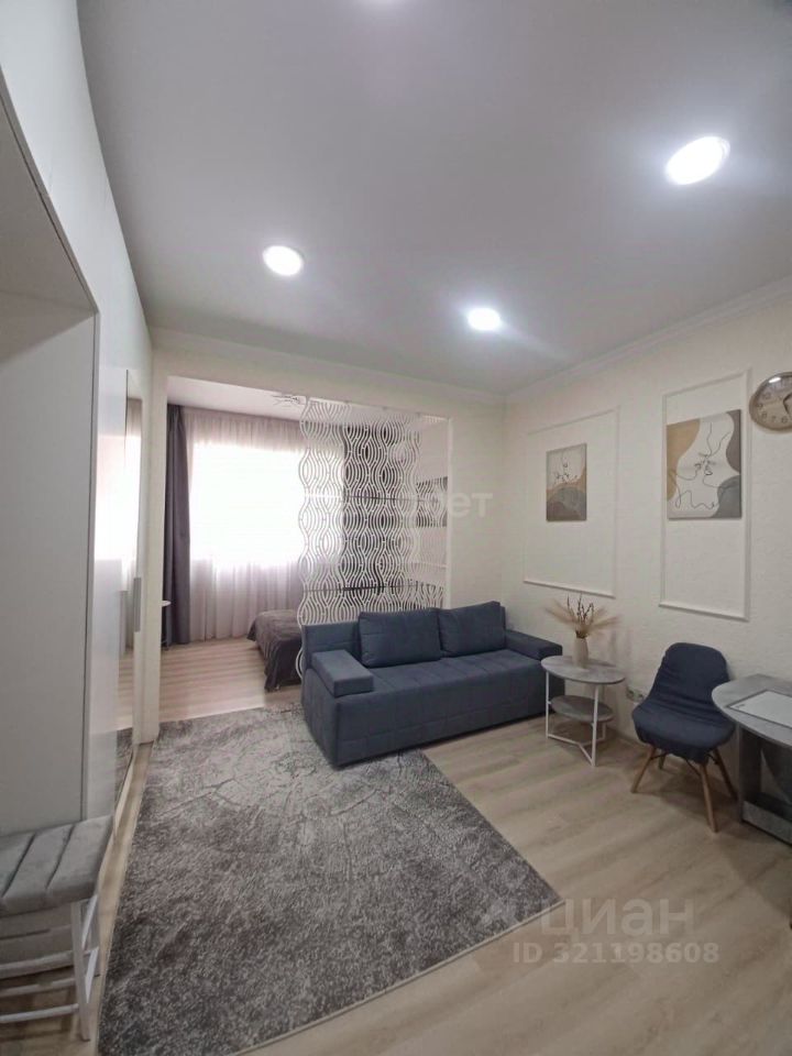 Студия зонирована на спальную,гостиную зоны и кухню.