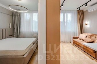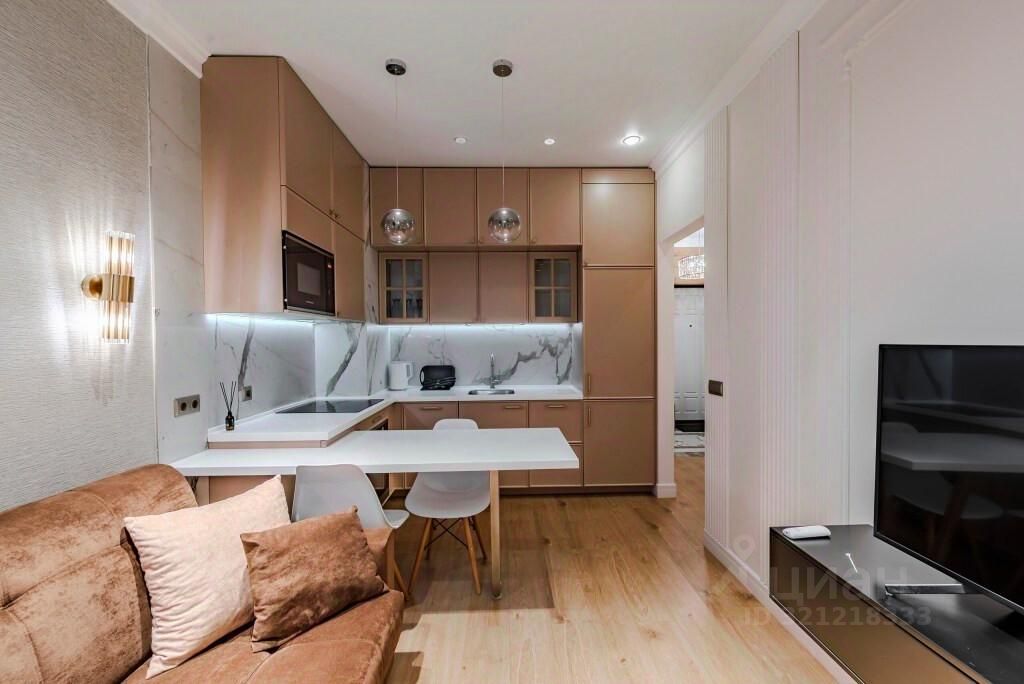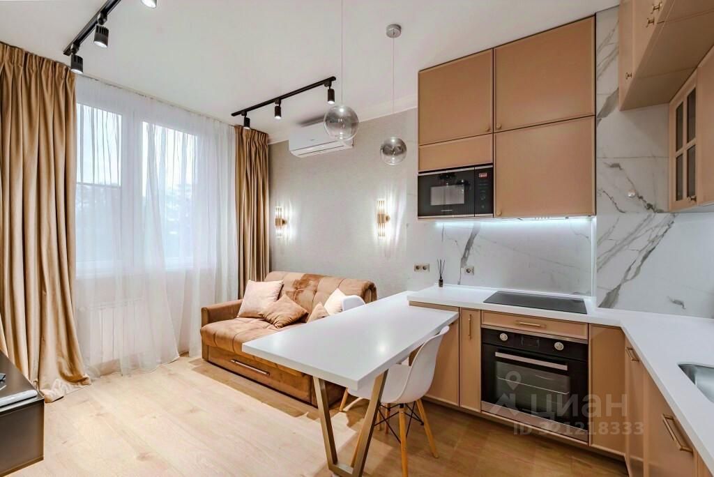Светлая и просторная гостиная совмещена с кухней, что создает ощущение единого пространства. Кухня оснащена современной техникой и практичной мебелью, а в гостиной установлен удобный диван. В спальне можно увидеть комфортабельную кровать и стильные элементы интерьера.