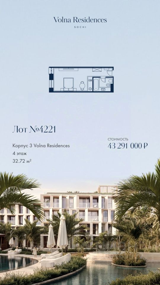 Продаётся 1-комнатная квартира в строящемся доме (Дом 3), срок сдачи: II-кв. 2028, общей площадью 32.72 кв.м., на 4 этаже. Volna Residence - это комплекс для жизни на территории комплекса Volna, объединённый с отелем общей концепцией и инфраструктурой. 3 малоэтажных корпуса на 520 номеров расположены на первой береговой линии и имеют собственный бассейн. Территория комплекса Volna - 7,2 га. Более половины этой территории занимает парк и инфраструктура для жизни и отдыха.