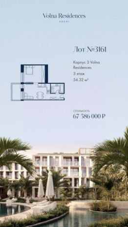 Продаётся 1-комнатная квартира в строящемся доме (Дом 3), срок сдачи: II-кв. 2028, общей площадью 54.32 кв.м., на 4 этаже. Volna Residence - это комплекс для жизни на территории комплекса Volna, объединённый с отелем общей концепцией и инфраструктурой. 3 малоэтажных корпуса на 520 номеров расположены на первой береговой линии и имеют собственный бассейн.