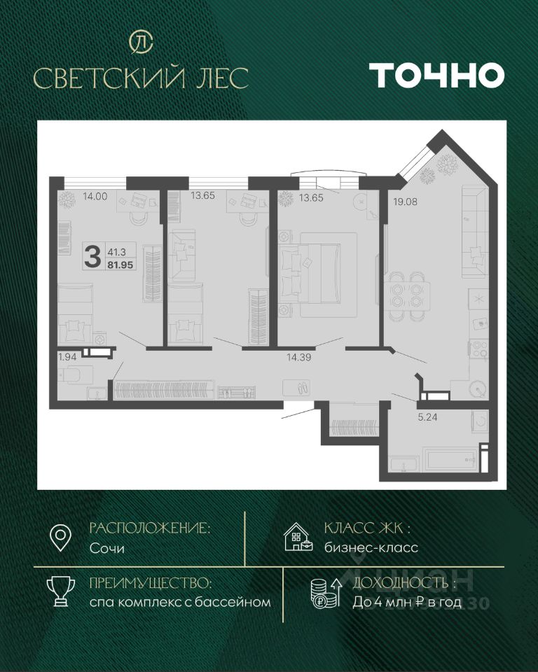 Светский лес - эксклюзивный жилой проект бизнес-класса в Сочи. Это остров цивилизации и технологий в окружении дикой природы национального парка с богатой инфраструктурой, наполненной различными сценариями премиального отдыха и жизни. Общественное пространство ЖК включает в себя прогулочные зоны, СПА комплекс с круглогодичным бассейном, детские и спортивные площадки, велодорожки, собственную набережную реки Сочи, торговую галерею с супермаркетами и ресторанами, а также инновационную школу и детский сад.