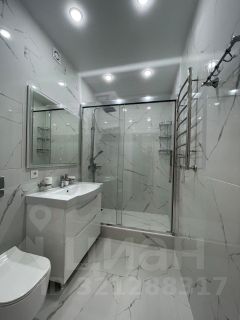Санузел оформлен в современном стиле с использованием качественной сантехники. Здесь имеется душевая кабина, умывальник и современные аксессуары, что создаёт гармоничное пространство для ухода за собой.