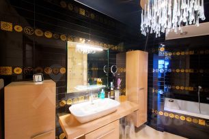 Освещение также продумано до мелочей: хрустальные люстры и точечная подсветка с регулируемой температурой света создают комфортную обстановку в любое время суток. Кухня выполнена по последнему слову техники — здесь находится гарнитур из массива ореха с столешницей из кварцевого агломерата, а встроенная техника премиум-класса (Miele, Gaggenau) делает готовку настоящим удовольствием. Санузлы оформлены с изяществом: санфаянс от Villeroy & Boch, смесители с позолотой и мозаичная плитка создают атмосферу роскоши.