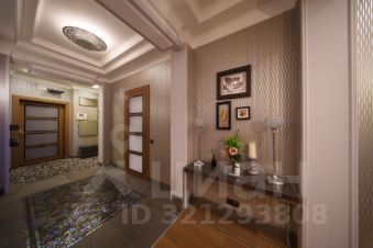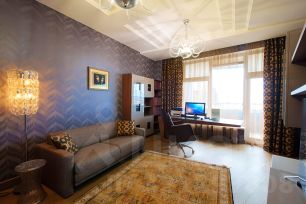 Эта квартира впечатляет своим классическим стилем с элементами итальянской эстетики, который подчеркивает её статус и изысканность. Внутреннее оформление выполнено с использованием исключительно высококачественных материалов. Стены и потолки украшены декоративной штукатуркой с золотым напылением, а также ручной лепниной и молдингами из натурального дерева, создающими уютную атмосферу. Напольные покрытия из мрамора в гостиной и санузлах, а также дубовый паркет в спальнях, говорят о безупречном вкусе владельца.