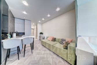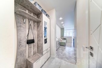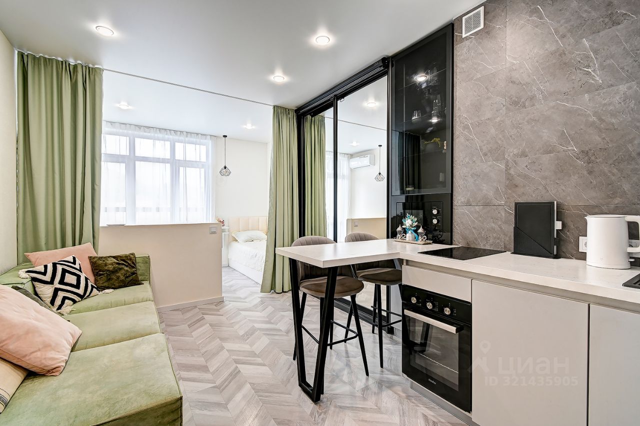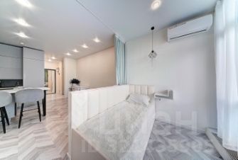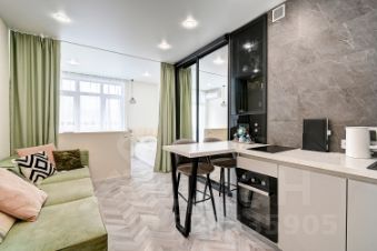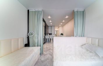 Максимально вместительная студия 33 м.кв., места хранения продуманы до мелочей.