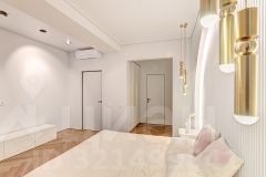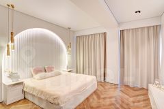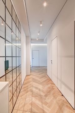 • Дизайнерский проект в светлых тонах: паркет ёлка, декоративная подсветка, акцентные светильники.
