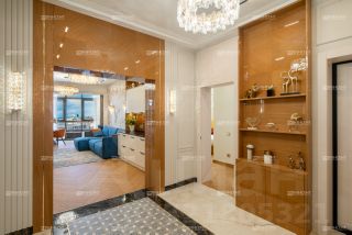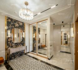 - Кристальные люстры, встроенные светильники, декоративные панели на стенах.