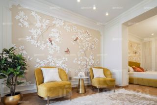 - Ботанические обои с птицами и цветами — как в интерьере дворца.
