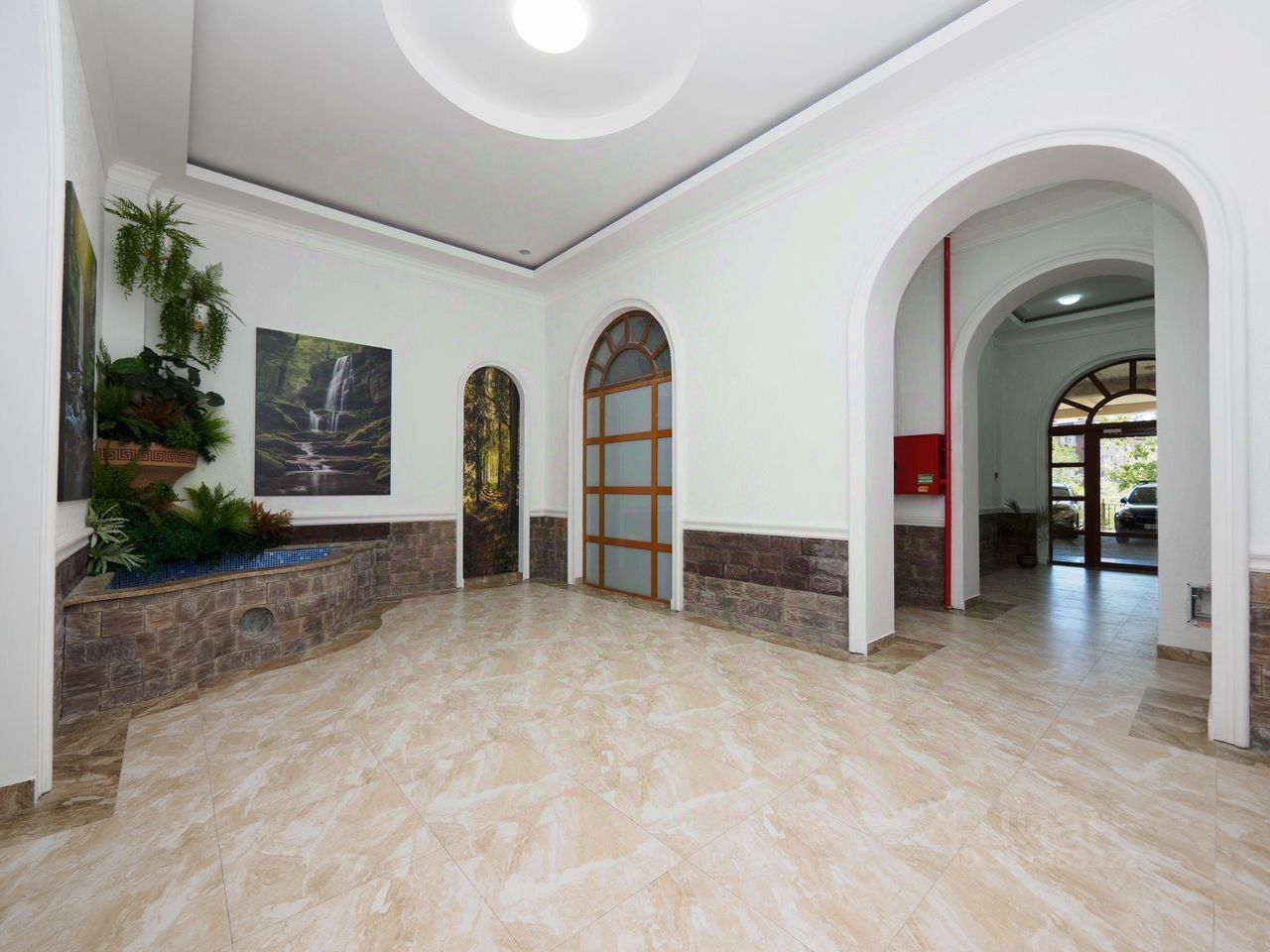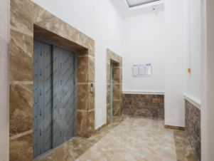 Огороженная территория под шлагбаумом. 2 современных лифта. Отделка мест общего пользования — очень качественная и в светлых тонах, в доме идеальная чистота. Красивая входная группа.