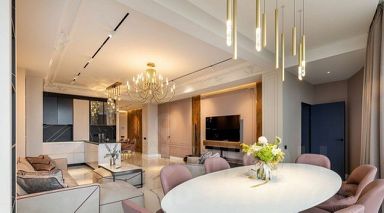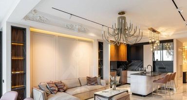 • Освещение/оснащение: многоуровневый свет (люстры, треки, контурная подсветка), кондиционирование, встроенные системы хранения по всей квартире.