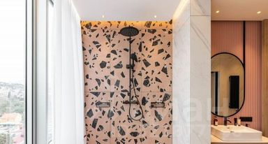 • Санузлы/гардероб: керамогранит под мрамор + панели под дерево, чёрные смесители. Акцентная душовая из терраццо с тропическим душем. Просторная гардеробная с модульными системами.