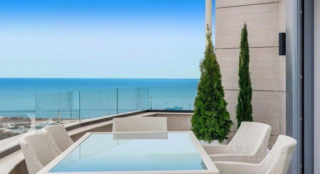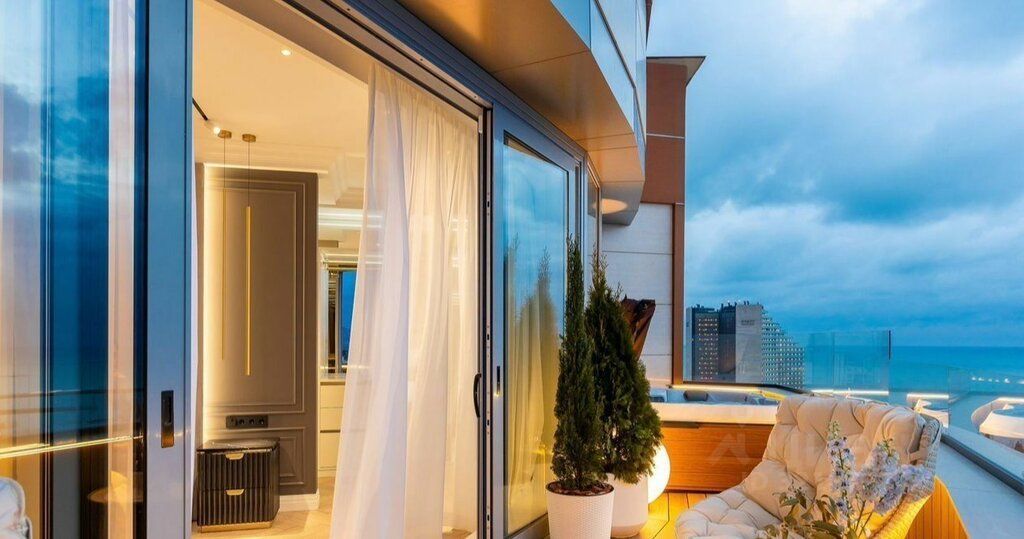 • Терраса: широкая, со стеклянным ограждением, декинг, лаунжмебель. Прямой вид на море.