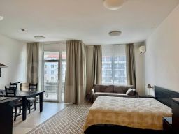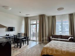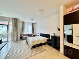 Студия оборудована балконом, откуда открывается восхитительный вид на благоустроенный внутренний двор, озелененные территории и спортивные площадки. Комплекс предлагает различные удобства, включая бассейн и детские игровые зоны, что делает его отличным выбором как для постоянного проживания, так и для аренды.