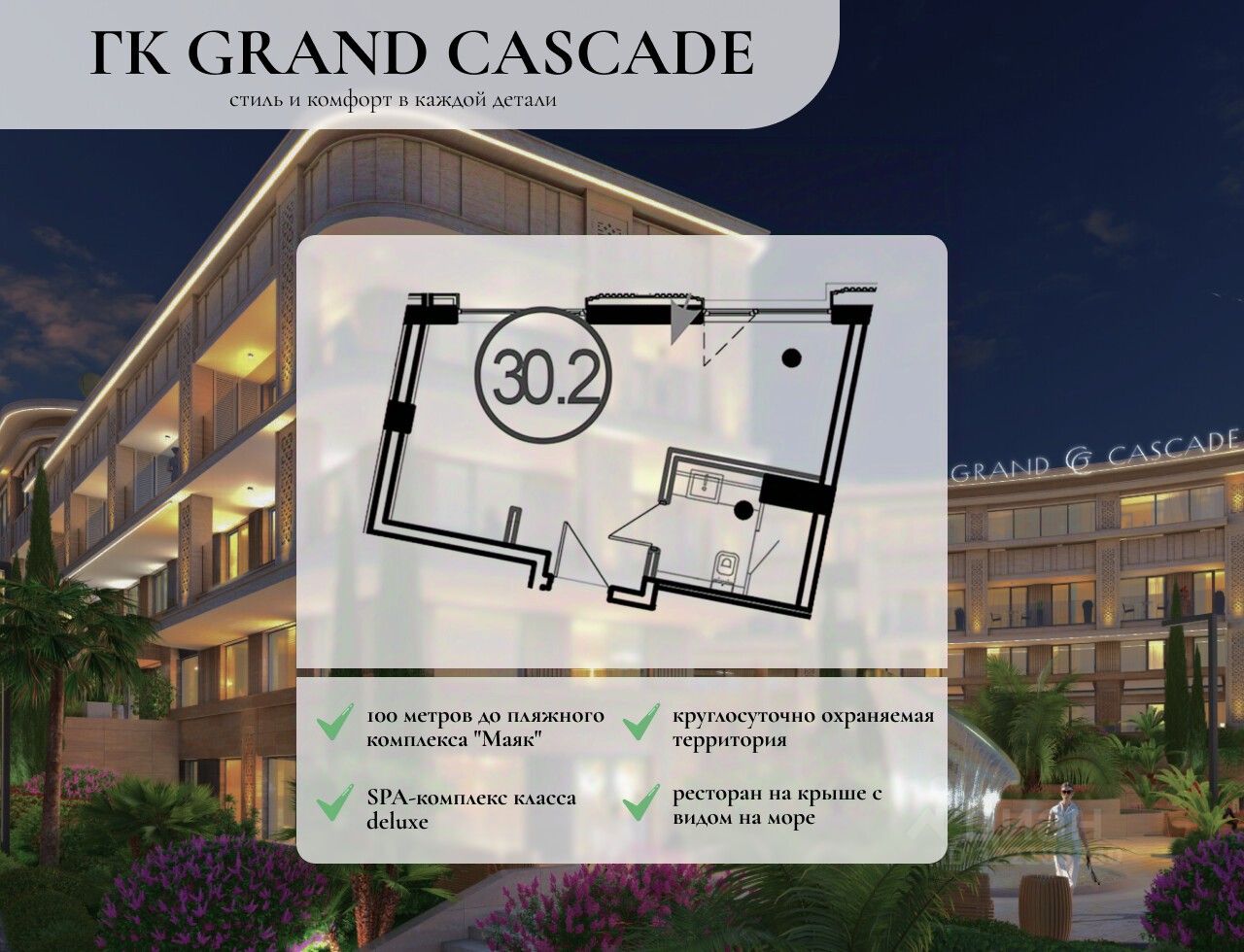 Комплекс находится в самом сердце Сочи, в точке начала истории курорта, среди знаковых мест: историческое здание Казначейства, арт-пространство Форт, Поцелуевский сквер, Курортный проспект, Концертный зал Фестивальный, фонтанный комплекс и старейший храм города Михаила Архангела! Благодаря грамотному архитектурному решению из всех номеров открывается потрясающий обзорный вид на море и центр курорта. Grand Cascade состоит всего из 140 номеров, которые сдаются с премиальной отделкой "под ключ" и встроенной мебелью. Самый просторный люксовый СПА в центральной части города Сочи будет настоящим наслаждением для гостей комплекса все современные методики оздоровления и релакса к услугам жителей. Спортивный зал, тренажеры, занятия с персональными тренерами. Гостиничный комплекс будет обслуживать звездная управляющая компания, предугадывая все запросы своих взыскательных жителей консьерж-сервис 5* Круглосуточно охраняемая территория, видеонаблюдение по всему периметру комплекса. Въезд через КПП.