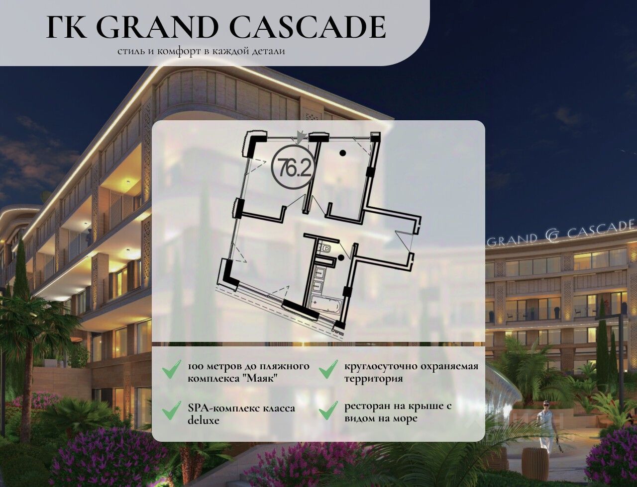 Комплекс находится в самом сердце Сочи, в точке начала истории курорта, среди знаковых мест: историческое здание Казначейства, арт-пространство Форт, Поцелуевский сквер, Курортный проспект, Концертный зал Фестивальный, фонтанный комплекс и старейший храм города Михаила Архангела! Благодаря грамотному архитектурному решению из всех номеров открывается потрясающий обзорный вид на море и центр курорта. Grand Cascade состоит всего из 140 номеров, которые сдаются с премиальной отделкой "под ключ" и встроенной мебелью. Самый просторный люксовый СПА в центральной части города Сочи будет настоящим наслаждением для гостей комплекса все современные методики оздоровления и релакса к услугам жителей. Спортивный зал, тренажеры, занятия с персональными тренерами. Гостиничный комплекс будет обслуживать звездная управляющая компания, предугадывая все запросы своих взыскательных жителей консьерж-сервис 5* Круглосуточно охраняемая территория, видеонаблюдение по всему периметру комплекса. Въезд через КПП.