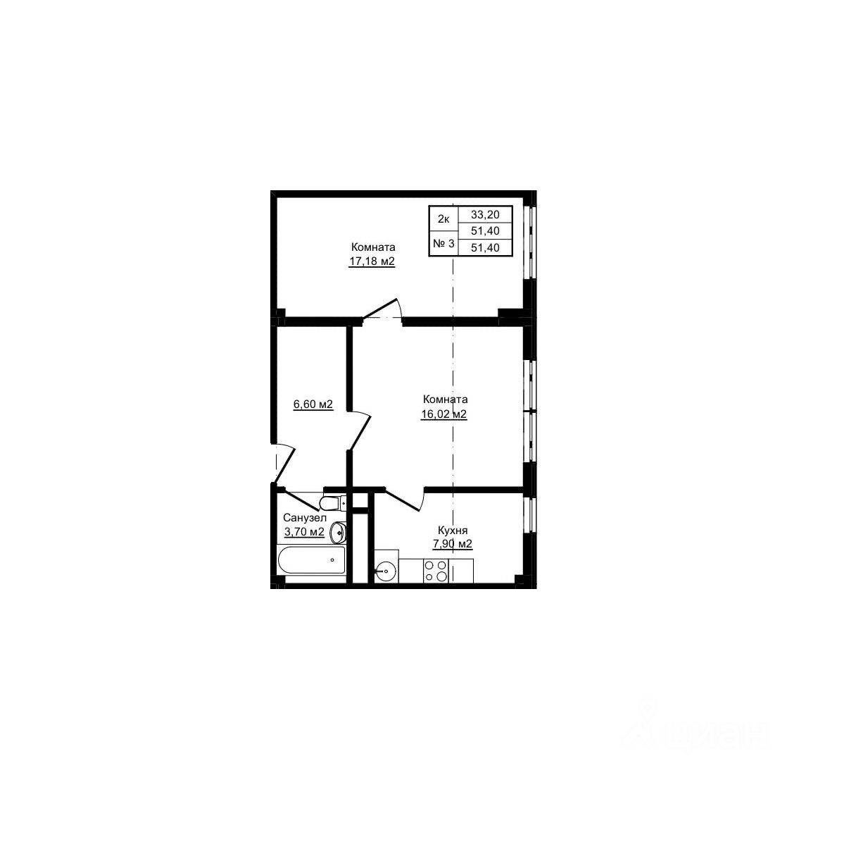 Общая площадь51,4 м²