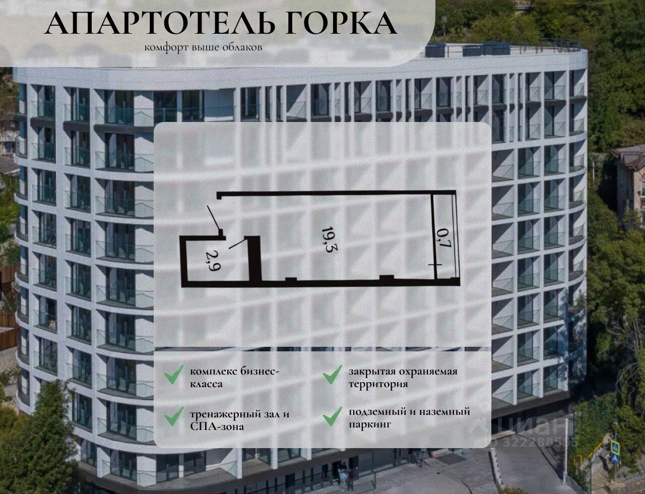 AK "Горка" (апарт-комплекс Горка) — это комплекс бизнес-класса, со своей закрытой и охраняемой территорией, ландшафтным озеленением, подземным и надземным паркингом, кафе-рестораном, тренажерным залом со СПА-зоной. Комплекс расположен на ул. Шоссейная в тихом и уютном микрорайоне "Хоста", который является санаторно-курортной зоной. Здание апарт-комплекса 11-ти этажное монолитно- каркасное. Цокольный этаж — подземный паркинг, 1-ый этаж — коммерческий, 9 жилых этажей. Фасад здания — вентилируемый, выполнен из керамогранита. В каждом апартаменте панорамное остекление с раздвижным алюминиевым профилем. Стекла нового поколения с системой Energy Light. Отделка входной группы и зоны ресепшн выполнена из натурального белого мрамора, как в лучшем пятизвездочном отеле. Круглосуточно работающий консьерж, видеонаблюдение. Коммуникации — центральные, собственная общедомовая газовая котельная, и единая система кондиционирования. На все коммуникации устанавливаются индивидуальные счетчики. Для удобства получения собственниками прибыли от сдачи апартаментов, в AK "Горка" предусмотрена лояльная система доверительного управления через управляющую компанию.