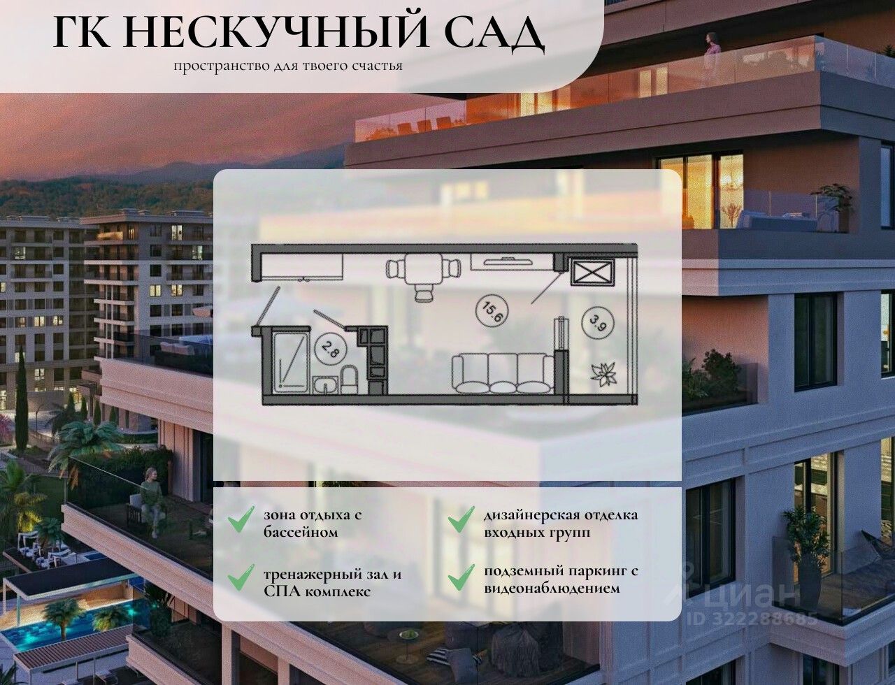 В проекте предложено множество планировочных решений: в наличии апартаменты, как классического типа, так и европланировки. Сдаются они без отделки и высотой потолков от 2.7 метров. Из окон номеров гостиничного комплекса "Нескучный сад" открывается неповторимый вид на горные вершины и Черное море.