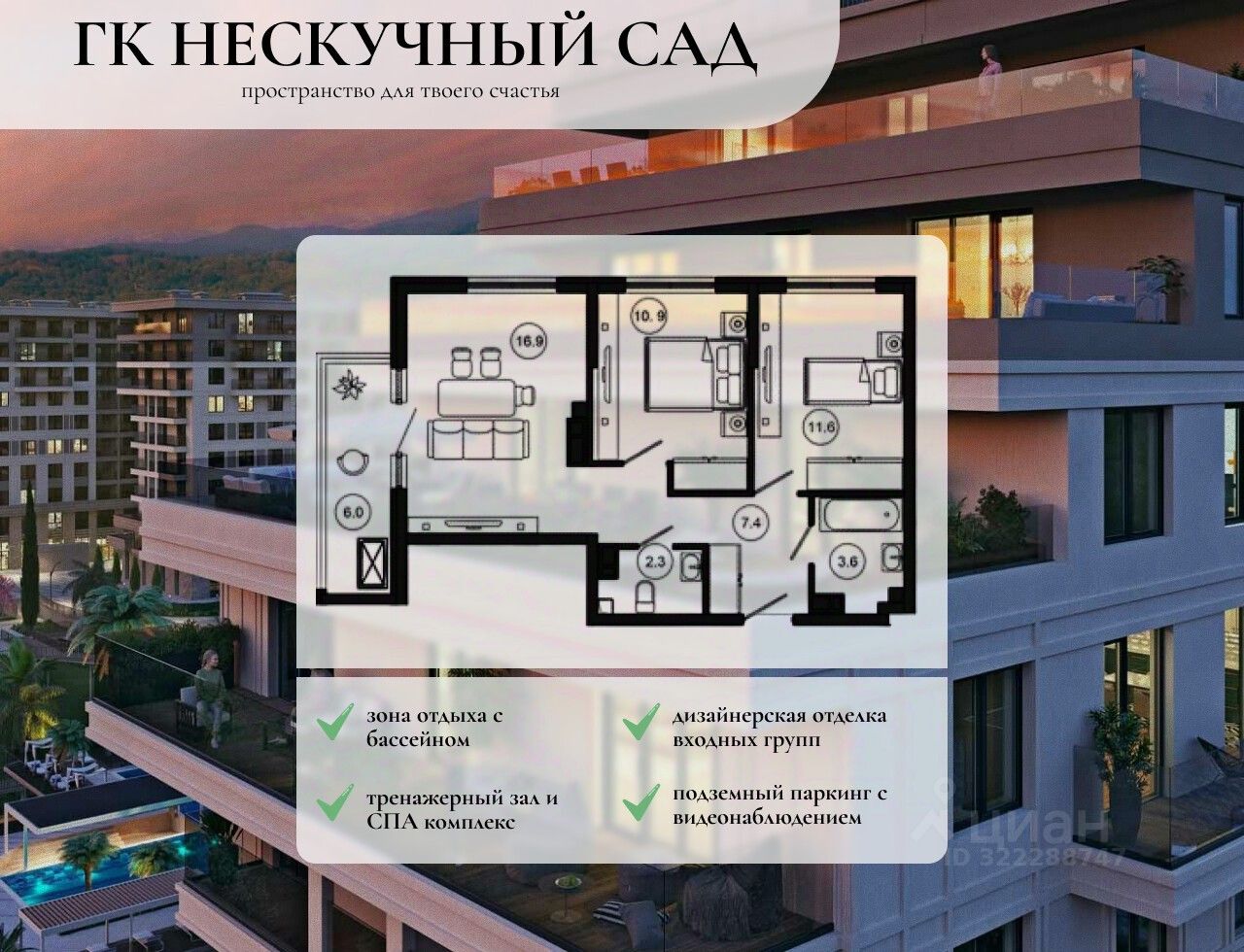 Проект представляет собой 2 дома высотой в 10 этажей. В облицовке стен корпусов используется энергоэффективный навесной вентилируемый фасад. Во всех домах выполнена дизайнерская отделка входных групп и установлены современные лифты. В проекте предложено множество планировочных решений: в наличии апартаменты, как классического типа, так и европланировки. Сдаются они без отделки и высотой потолков от 2.7 метров. Из окон номеров гостиничного комплекса "Нескучный сад" открывается неповторимый вид на горные вершины и Черное море. На внутренней закрытой территории проекта выполнен ландшафтный дизайн. Инфраструктура комплекса включает в себя: зону отдыха с просторным бассейном на открытом воздухе, современный SPA-комплекс с широким спектром косметических и оздоровительных процедур, просторный тренажерный зал с оборудованием, отвечающим высоким мировым стандартам, круглосуточный ресепшн и услуги консьерж-сервиса для решения любых задач 24/7, бутики известных брендов и ресторан. Для детей предусмотрен Детский центр с разнообразными развивающими и развлекательными программами. На территории комплекса спроектирован подземный паркинг с профессиональными парковщиками и видеонаблюдением. Проект расположен в Хостинском районе. Инфраструктура развита, в пешей доступности: магазины, кафе, банкоматы, медицинские учреждения, школы, детские сады. За 15 минут транспортом можно добраться до международного аэропорта Сочи, 30 минут до центральной набережной, 45 минут до курорта Красная Поляна.