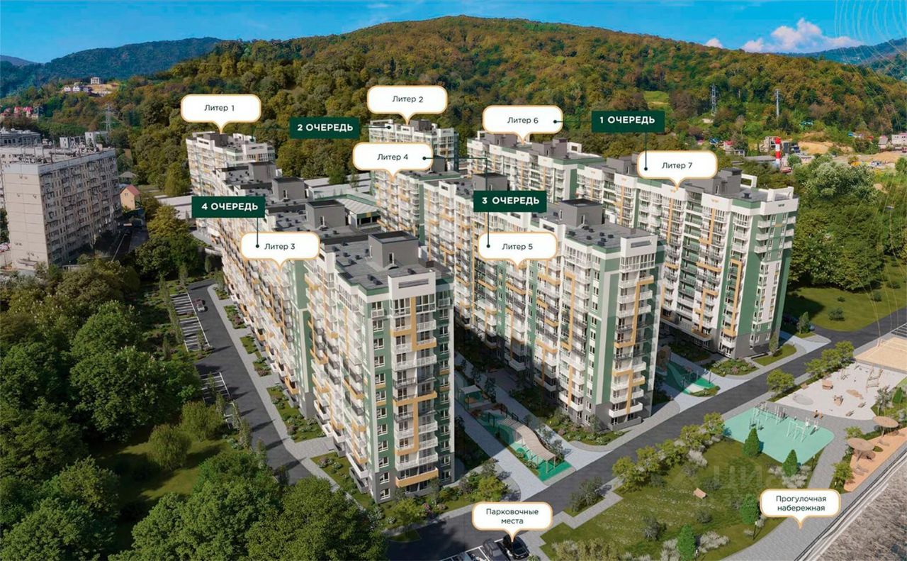 Проект включает в себя 7 жилых корпусов высотой 12 этажей. В подъездах выполнена дизайнерская отделка в светлой цветовой гамме с яркими акцентами, для удобства жителей в местах общего пользования предусмотрена навигация. В каждой секции предусмотрены помещения для хранения велосипедов и колясок с обустроенным местом для мойки колес и лап домашних животных. Покупателям в ЖК предложено множество планировочных решений: в наличии квартиры, как классического типа, так и европланировки. Из окон открываются виды на реку и горы. Квартиры сдаются без отделки. В состав комплекса входит школа на 2 000 мест, детский сад на 550 мест и фитнес-центр. На первых этажах расположены коммерческие помещения. Во дворах установлены детские площадки, спортивные комплексы и деревянные беседки для отдыха. По периметру ЖК ведется видеонаблюдение, к которому можно подключится online при помощи специального приложения для мобильных устройств. Рядом с комплексом располагается благоустроенная набережная реки Кудепста. Комплекс расположен в микрорайоне Кудепста города Сочи. В окрестностях района находится большая плантация пробкового дуба. В пешей доступности есть школы, детские сады, магазины, медучреждения, салоны красоты и места для отдыха. Комплекс расположен в 1,9 км от моря, и 7 км до Сочи.