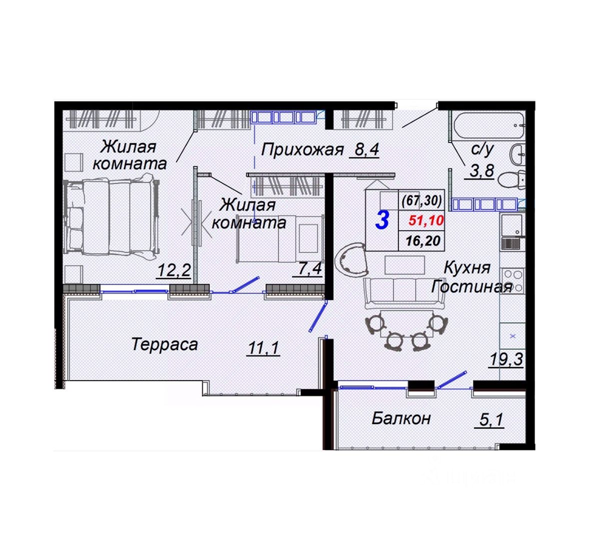Общая площадь67,3 м²