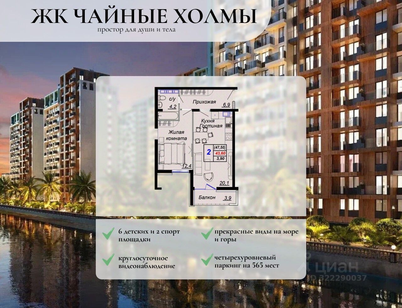 Жилой комплекс "Чайные холмы" - идеальное место для тех, кто ищет спокойствие, красоту и гармонию в окружении природы. Расположенный в курортной зоне Черноморского побережья, в пгт Дагомыс, этот жилой комплекс предлагает уникальное сочетание красивых пейзажей и экологической чистоты. Архитектурные решения зданий жилого комплекса поражают своей элегантностью и сдержанной красотой. ЖК включает в себя 8 монолитных домов переменной этажности от 15 до 16 этажей. Строгие формы линий внешнего вентилируемого фасада в сочетании со светлыми поверхностями стен создают атмосферу изысканности и эстетической привлекательности. А вечером при включенной подсветке жилой комплекс выглядит невероятно утонченно и стильно. Жилой комплекс является настоящим уголком рая. Это непревзойденный уровень комфорта и качества жизни. Свежий воздух, прекрасные виды на чайные плантации, море и горы - все это станет вашим ежедневным спутником. Вы просыпаетесь с чувством благодатного места, где природа воплощена в каждой детали. Все квартиры представлены со свободной планировкой, что позволит воплотить ваши самые смелые архитектурные и дизайнерские идеи. Высокие потолки 2,95 м создают атмосферу простора и свободы. В ЖК предусмотрено дистанционное управление шлагбаумом, круглосуточное видеонаблюдение и консьерж-сервис, которые обеспечат вам ощущение безопасности и спокойствия. Четырехуровневый паркинг на 565 мест и автостоянка на закрытой территории, предоставляющая более 130 мест для автовладельцев. На территории также располагается 3-х этажное здание дополнительного образования, где ваши дети смогут получить качественное образование. Тренажеры и воркаут зоны для поддержания физической формы и здоровья, а также 6 детских площадок и 2 спортивные площадки для активного отдыха и занятий спортом. ЖК "Чайные Холмы" предлагает широкий выбор инфраструктуры для вашего удобства. Рядом с комплексом расположены детские сады, школы, магазины, аптеки и рынок - все, что необходимо для полноценной жизни. А до одного из самых лучших пляжей Сочи, который носит международный знак качества "Голубой Флаг", всего 3 километра пешком по живописной набережной протяженностью более 1 километра, оборудованной скамейками с навесами. Не упустите возможность приобрести свое идеальное жилье! Обратитесь к нам прямо сейчас, и наши специалисты ответят на все ваши вопросы и помогут подобрать лучшие планировочные решения.