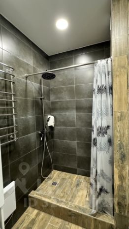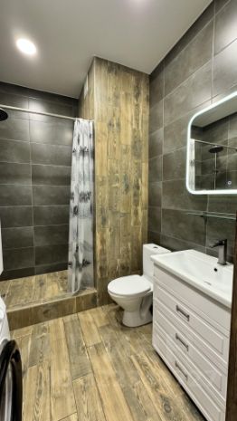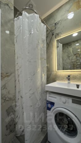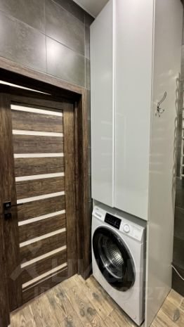 Ванная комната просторная : душевая, сан. узел, стиральная машинка, шкаф под полотенца и моющие средства.