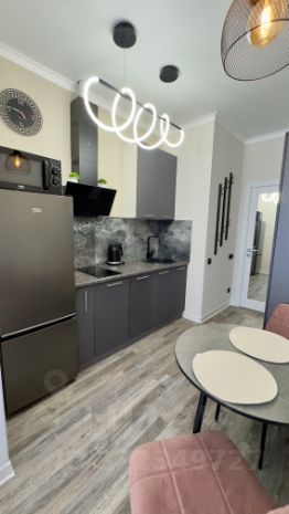 Просторная кухонная зона с плитой, вытяжкой, микроволновкой и холодильником.