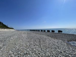 До моря и ж/д станции 5-7 минут ходьбы по ровной пешеходной дорожке. Пляж отличный.