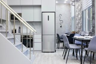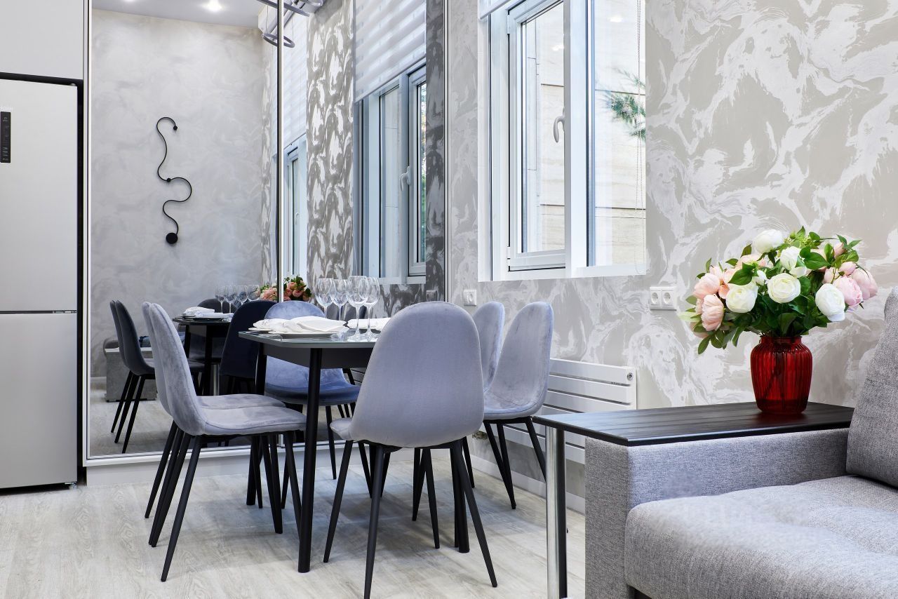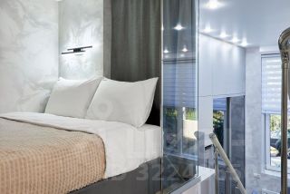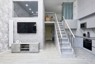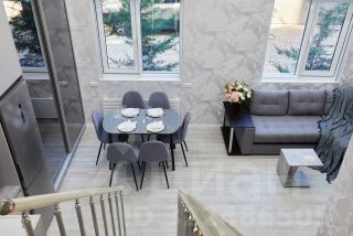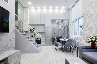Двухуровневое пространство квартиры воплощает гармонию функциональности и эстетики. На первом уровне просторная кухня-гостиная с панорамным остеклением объединяет зону для приготовления пищи и отдыха. Раскладной диван премиум-класса, современная мультимедийная система и полноценный обеденный уголок создают атмосферу для приема гостей и семейных вечеров.