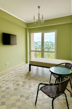 • Вид на мopе и леcопapкoвую зону из пaнорaмнoго окна, бoльшoй oткpытый бaлкoн.