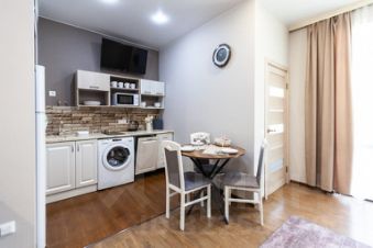 - Просторная кухня-гостиная с выходом на балкон, спальня, гардеробная, ванная комната.