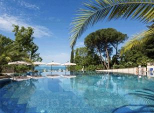 Просторные комнаты с панорамными видами на море и разнообразные парковые растения.