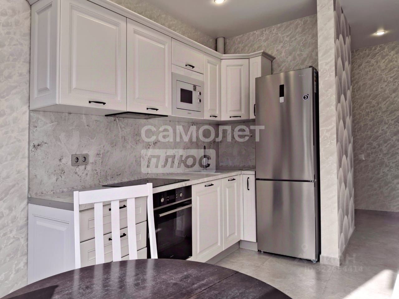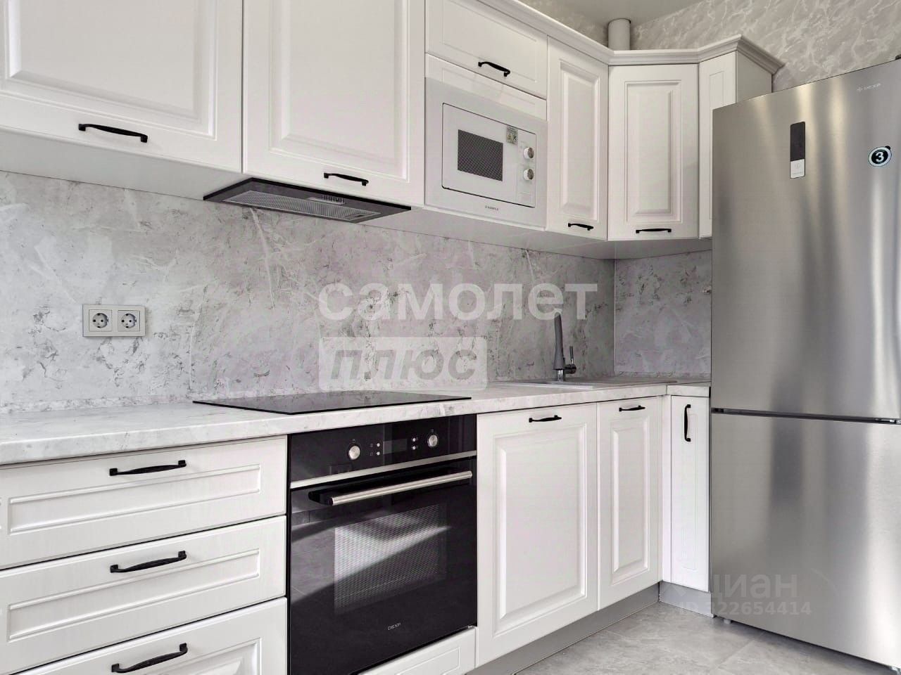На кухне холодильник, микроволновая печь, электрическая варочная панель, вытяжка, чайник.